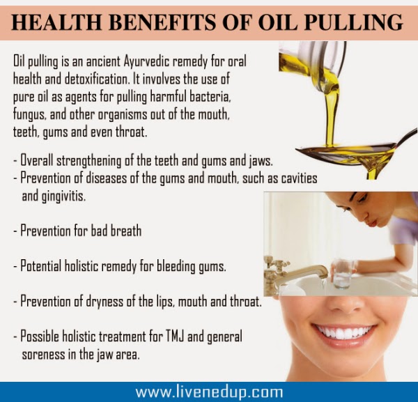 Oil pulling or oil swishing is a folk remedy where oil is "swished" (kavala graha) or "held" (snigda gandoosha) in the mouth.